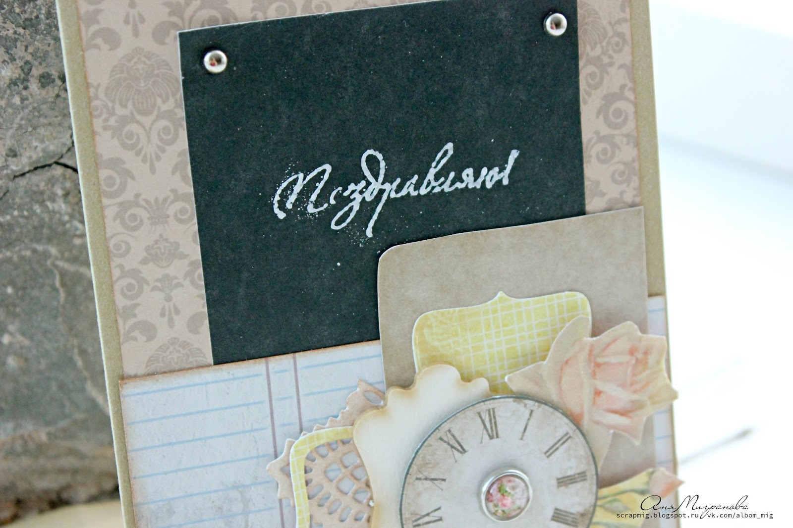 В работе использован лист "Мечты" из коллекции "Натюр", брадс из коллекции "Старый парк", чипборд вензель из набора коллекции "Старый парк", чипборд с часиками из набора коллекции "Старый парк", мини-розы персикового цвета, лилия.
